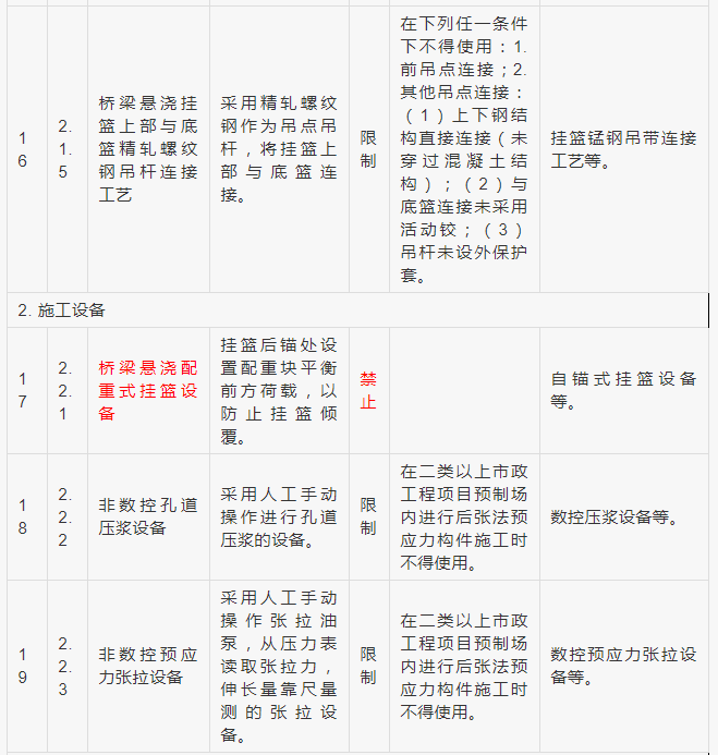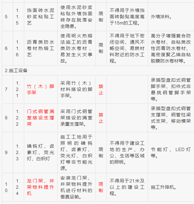 限制使用范圍:限制用于危險性較大的分部分項工程;自2022年1月1日起全面禁止使用。