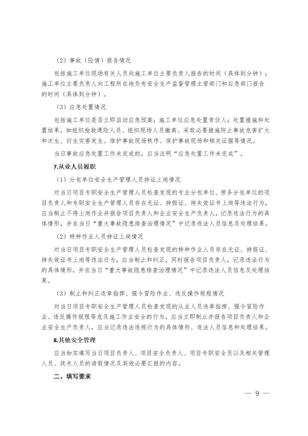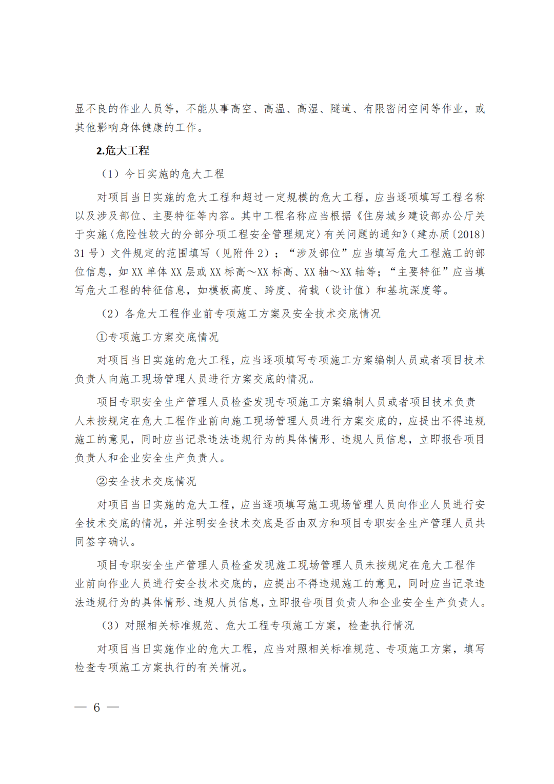 項(xiàng)目當(dāng)日存在下列情形之一的,還應(yīng)當(dāng)由施工單位項(xiàng)目負(fù)責(zé)人簽字確認(rèn):1.存在危大工程或超危大工程施工的;2.檢查發(fā)現(xiàn)存在重大事故隱患的;3.建設(shè)行政主管部門、有關(guān)部門下發(fā)限期整改通知書、停工整改通知書或行政處罰決定書的;4.發(fā)生生產(chǎn)安全事故(險(xiǎn)情)的。