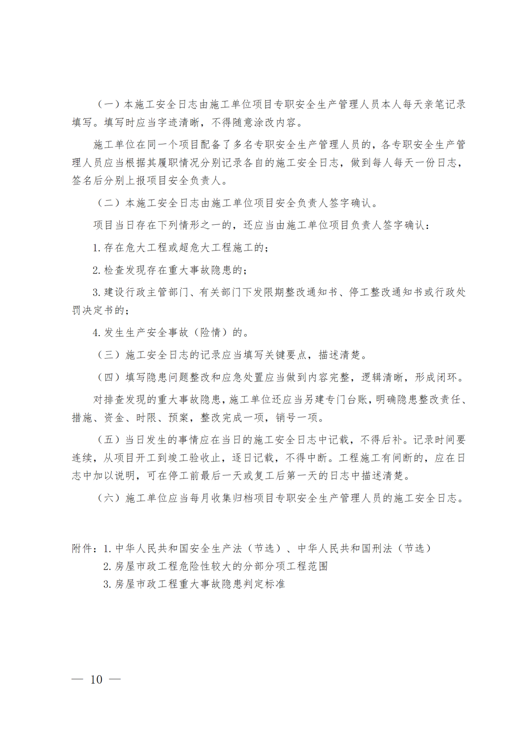 為進(jìn)一步壓實(shí)施工企業(yè)的安全生產(chǎn)主體責(zé)任,督促施工現(xiàn)場專職安全生產(chǎn)管理人員履職盡責(zé),切實(shí)提升房屋市政工程施工的安全管理水平,依據(jù)《中華人民共和國安全生產(chǎn)法》《建設(shè)工程安全生產(chǎn)管理?xiàng)l例》《住房和城鄉(xiāng)建設(shè)部辦公廳關(guān)于做好房屋市政工程安全生產(chǎn)治理行動(dòng)鞏固提升工作的通知》,結(jié)合我省實(shí)際,我廳組織編寫了《房屋市政工程施工安全日志(范本)》(以下簡稱《安全日志》),現(xiàn)印發(fā)給你們。請結(jié)合以下要求,抓好推廣施行。
